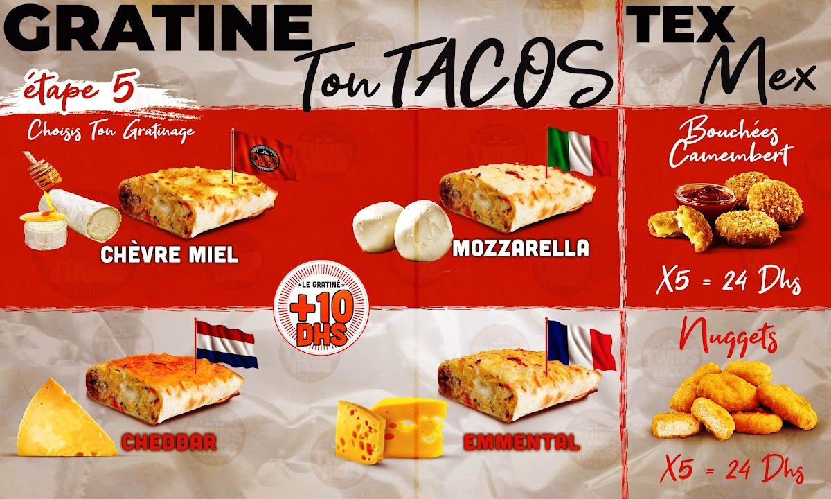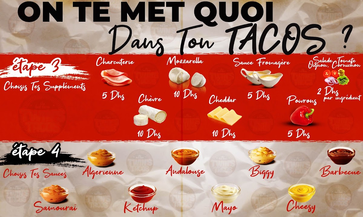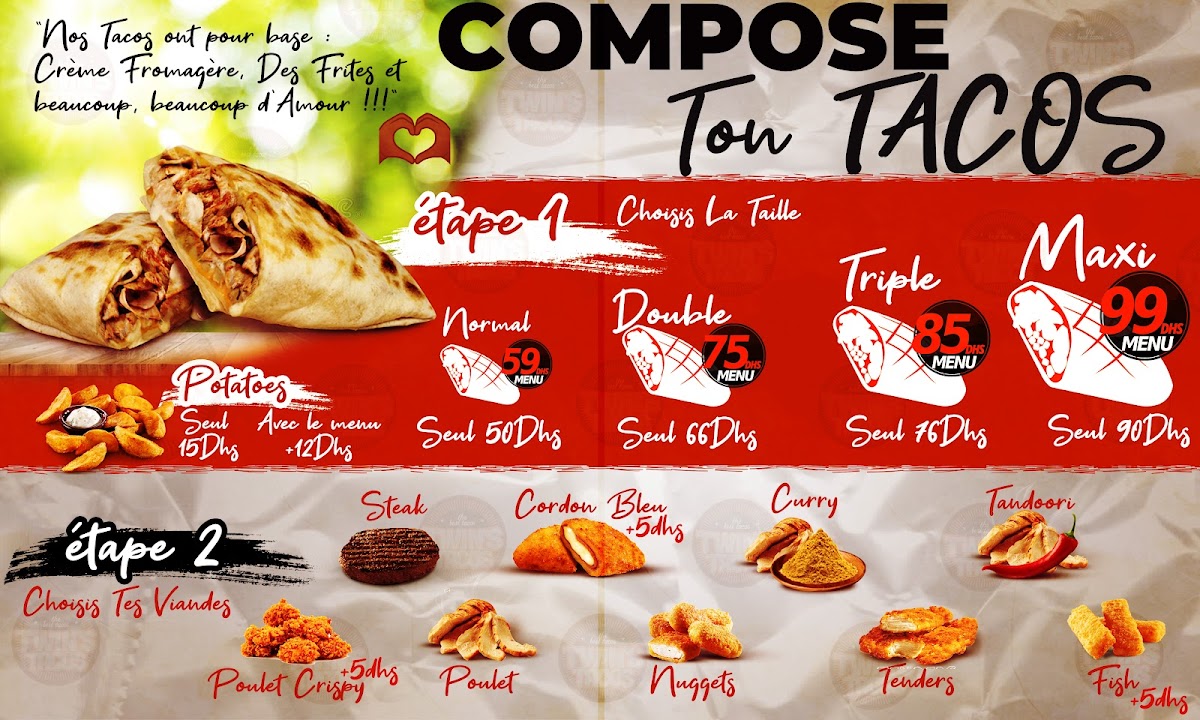 The menu at Twin's Tacos Playa in Tangier offers a delightful range of tasty options suited to various tastes. For the little ones, the Atfal Menu presents a choice between Mini Tacos and Nuggets, offering simple and delicious options. Taco lovers can choose from a variety of hearty tacos like the Tacos Triple, Tacos Normal, and Tacos Maxi, with the Tacos Double Maxi providing a satisfying double portion. For a sweet treat, the Pots De Glace selection includes indulgent flavors such as Toblerone Ice Cream, Oreo Ice Cream, and Nougat CaramelDaim Ice Cream. They also offer refreshing beverages like Hawaï, Fanta Orange, and Schweppes Mojito to accompany the meal. Those craving something extra can enjoy Camembert et Nuggets-a combination of Potatoes, Nuggets (5pcs), and Bouchée Camembert (5pcs). For those looking for a deal, the Deals Du Moment includes options like the Menu Tacos Normal, Menu Tacos Triple, or a combo of Nuggets (5pcs) + Frites + Boisson. To wrap up the meal, indulge in desserts like Tiramisu and Kinder Joy. This diverse menu is sure to satisfy any craving, whether you're in the mood for tacos, ice cream, or something sweet!